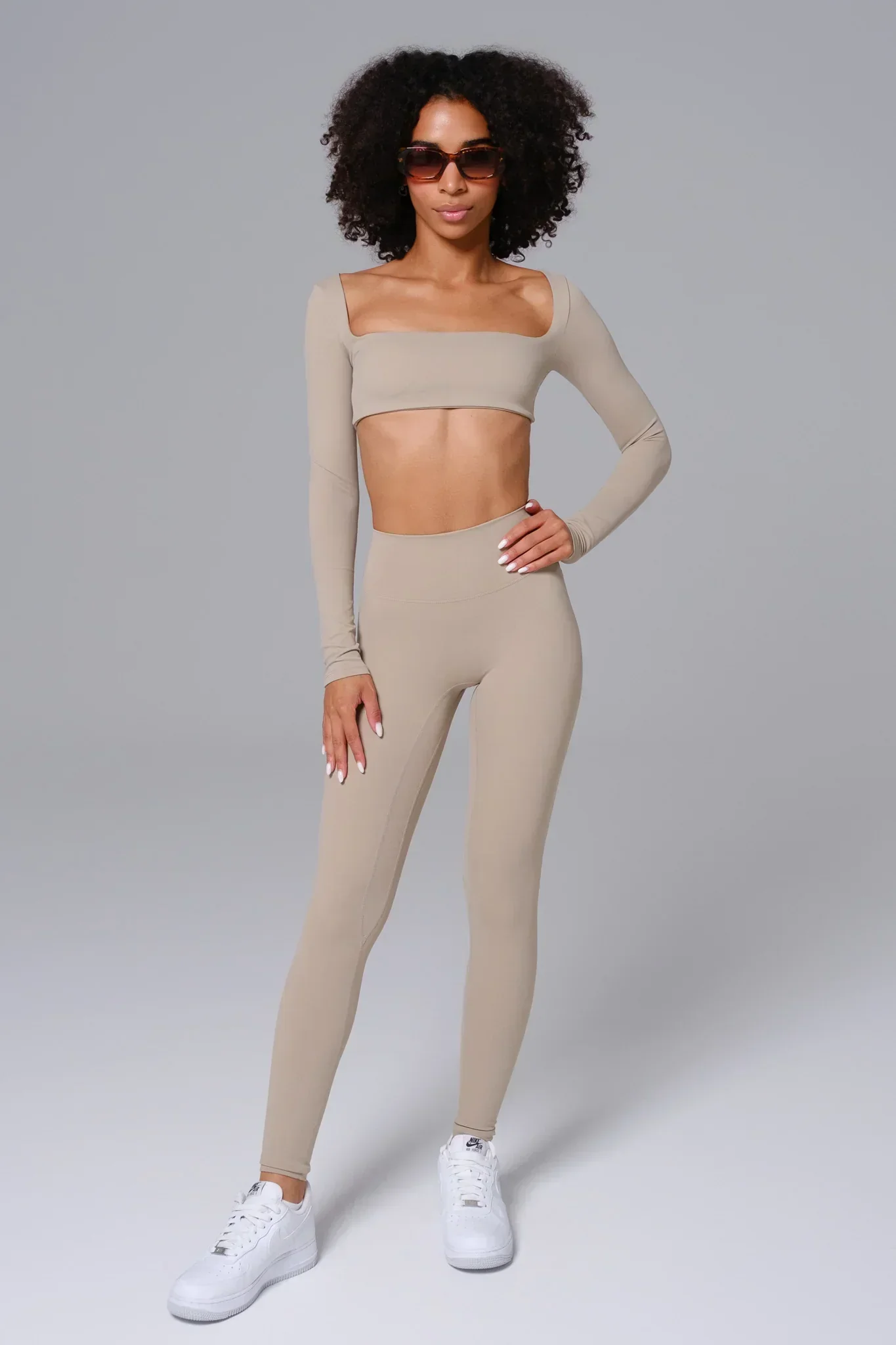 A long-sleeve crop top with built-in removable padding for light coverage and shape. The square neckline and second-skin fit make it a versatile studio-to-street piece—polished enough for errands, breathable enough for movement.