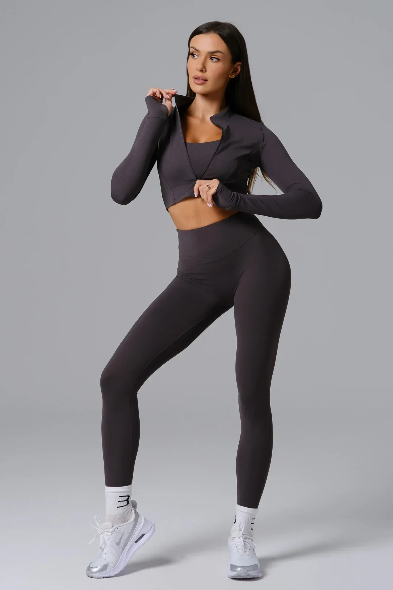 A cropped zip-up jacket designed for layering. Made with smooth, stretchy fabric for a second-skin fit, complete with long sleeves and thumbholes for added comfort. Perfect for warming up, cooling down, or everyday wear.